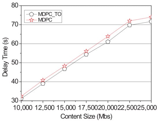 Figure 14 compares the performance differences between the delay time of MDPC and MDPC_TO. Delay time occurs when the cached content is transmitted to the vehicle to which the RSU has sent the request or the content is requested to the adjacent RSU and the content is being transmitted from the adjacent RSU. MDPC_TO has a lower delay time than MDPC because it is optimized where the delay time is minimized for cached contents.