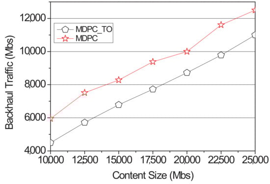 When the vehicle sends a request to the RSU, the RSU downloads the content on the content server. When requesting content from an RSU adjacent to the RSU, the content is distributed through a backhaul link. Backhaul traffic occurs in this case. Figure 15 shows a graph related to backhaul traffic of MDPC and MDPC_TO. MDPC_TO minimizes the content size requested by the neighboring RSU from the perspective of backhaul traffic, resulting in lower backhaul traffic than MDPC.