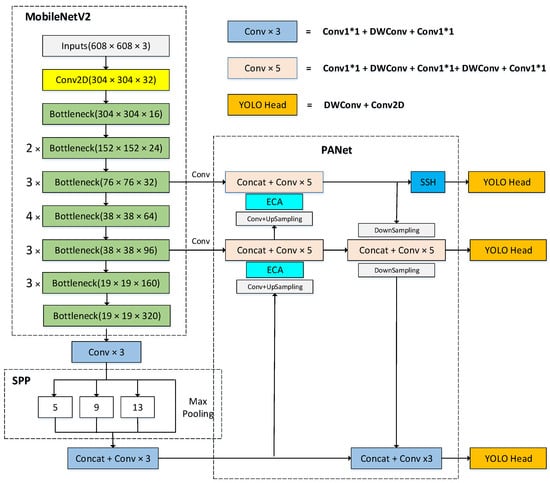 MobileYOLO not only uses the backbone network MobileNetV2 with deep separable convolution but also replaces part of the traditional convolution in the neck network and head network of the model with deep separable convolution (see Figure 2).