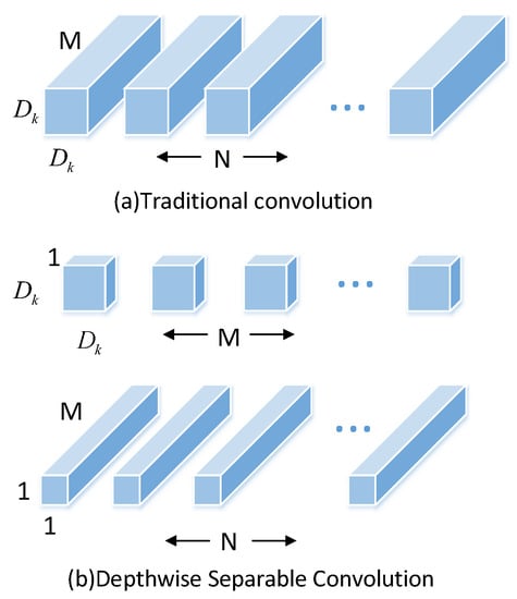 The depth separable convolution consists of the depthwise convolution (DWConv) operation and the pointwise convolution (PWConv) operation. The difference from the traditional convolution is shown in Figure 3. The depthwise separable convolution performs a convolution operation with a single convolution kernel size of 3 × 3 on each channel dimension of the input and then combines the features of all input channel dimensions by performing a standard convolution operation with a convolution kernel size of 1 × 1 improved features. The calculation amount of the standard convolution is k × k times different from the depth separable convolution (k is the size of the convolution kernel), which greatly reduces the number of model calculations without sacrificing accuracy.