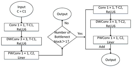 The bottleneck block structure of the MobileNetV2 network is shown in Figure 4. The inverted residual module is mainly used to promote the effective transmission of multi-layer feature information and enhance the feature extraction capability of the network. The inverted residual module first performs channel expansion through convolution with a convolution kernel size of 1 × 1 and then uses a deep convolution with a convolution kernel size of 3 × 3 to extract features, and finally, the channel dimension is compressed by the point-by-point convolution with the convolution kernel size of 1 × 1 in the linear bottleneck layer. When the bottleneck block used in MobileNetV2 is greater than 1, the bottleneck block contains the inverted residual module.