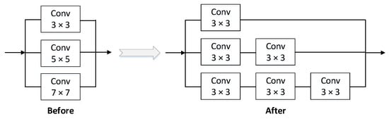Unlike the two-stage detector, SSH [] mimics the operation of contextual information enhancement by superimposing simple convolution. In the context module, multiple 3 × 3 size convolutions are used to simulate 5 × 5 and 7 × 7 convolution kernels. This method increases the receptive field corresponding to the asynchronous length of the corresponding detection layer and also replaces the larger convolution in this way. The kernel then reduces the number of parameters, as shown in Figure 6. (Note: The large convolution kernel can obtain a larger receptive field, but the number of parameters is larger. Using some smaller convolution kernel layers to stack up can achieve the same effect as the large receptive field while reducing the number of model parameters.)