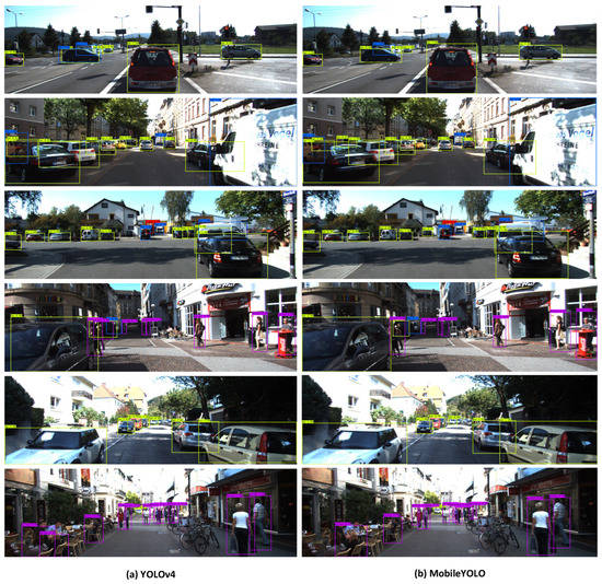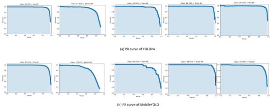 Figure 8 are the P–R curves of the detection results of YOLOv4 and MobileYOLO in the KITTI data set, respectively. The detection performance of the algorithms can be intuitively compared through the P–R curve. The results show that MobileYOLO is very close to YOLOv4 in detection accuracy.
