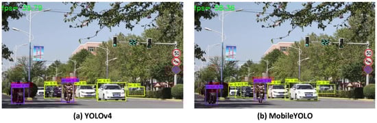 In order to verify the effectiveness of the object detection algorithms in natural scenes, a test experiment was carried out on the video. The experimental results are shown in Figure 10. The video is downloaded from the Internet, and the video size is 800 × 480. The purple and yellow detection boxes represent the detection of people and cars, respectively. It can be seen that the proposed MobileYOLO can effectively detect the objects in the video as a whole. Compared with YOLOv4, the FPS is nearly 20 higher, which further proves the superiority of the algorithm in the autonomous driving scenario.