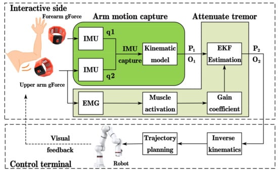 A telerobot system consists of two parts: (1) the interactive side and (2) the control terminal. The interactive side of teleoperation is composed of two gForcePro+ armbands, the arm motion capture module and tremor attenuation module, while the control terminal includes an xMate3 Pro robotic arm. After wearing the gForcePro+ armbands on the arm, the arm is perpendicular to the front plane as the initial position. First, the arm joint angles are captured using two IMUs, and the position P1 and orientation O1 of the arm’s end are obtained by a forward kinematic model. Second, the position P2 and orientation O2 are obtained by filtering the physiological tremor using the EKF with fused muscle activation. Then, P2 and O2 are mapped to the robot arm through Cartesian space. Finally, the inverse kinematics of the manipulator are solved, and the joint angles are obtained through trajectory planning to complete the end tracking motion. The overall scheme of the teleoperation system considered in this paper is shown in Figure 1.
