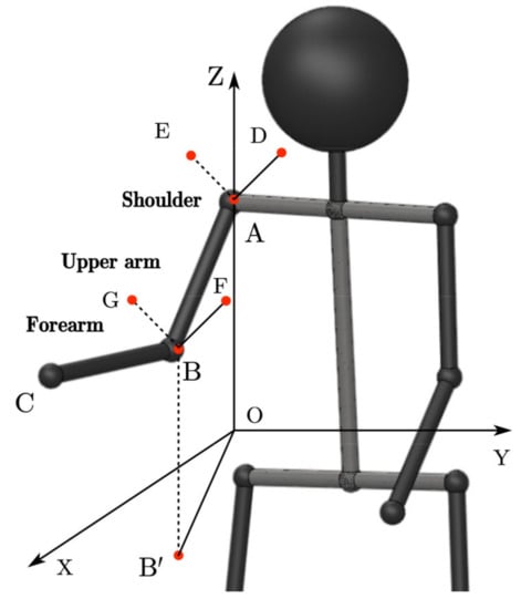 where ∠OAB is the shoulder pitch angle, ∠XOB’ is the shoulder yaw angle, ∠DAE is the shoulder roll angle, ∠ABC is the elbow updip angle and ∠FBG is the elbow roll angle.