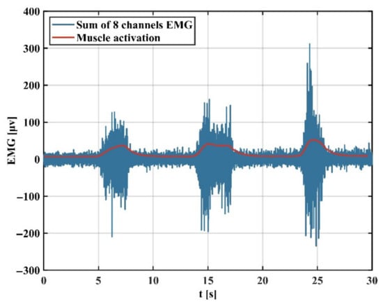 Figure 7 shows that the RMS feature is extracted from the blue sEMG signal and then filtered by an exponential moving average filter to obtain the muscle activation.
