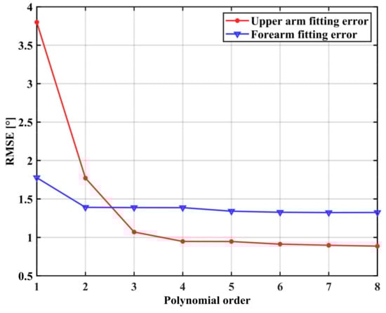 The IMU sampling frequency was 50 Hz, and the VICON sampling frequency was 1000 Hz. An adult male with a height of 173 cm and a weight of 63.9 kg was selected as a benchmark. One of the gForcePro+ armbands is placed on the middle of the upper arm/forearm and another is placed on the end of the upper arm/forearm. The roll angle data from both gForcePro+ armbands are collected simultaneously, and a polynomial fit is performed to obtain a functional relationship between the two. Figure 10 shows the relationship between the order of fit and RMSE. For the forearm roll angle correction, the RMSE reaches a small value when the polynomial order is 2, so increasing the polynomial order is not significant at this moment; for the upper arm roll angle correction, the RMSE reaches a small value when the polynomial order is 3, so increasing the polynomial order is not significant at this moment.