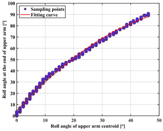 The polynomial fit equation between the mid and end rotation angles of the upper arm is obtained as Equation (25). The fitted curve is shown in Figure 11.