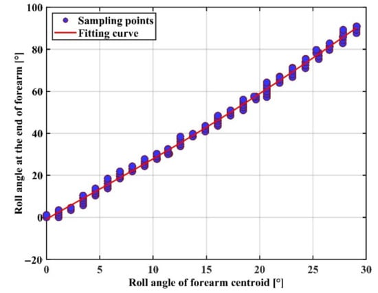 The motion capture theory described above is based on the assumption that the axis of rotation of the torsion joint is perfectly aligned with the limb segment. However, the gforcePro+ armband is worn at the centroid of the arm, which is quite different from the roll angle at the end of the arm, so angle conversion is required. The two gForcePro+ armbands were fixed at the centroid of the arm and the end of the arm, and the roll angle data were collected simultaneously. A polynomial fit was performed to obtain a functional relationship between the two.
