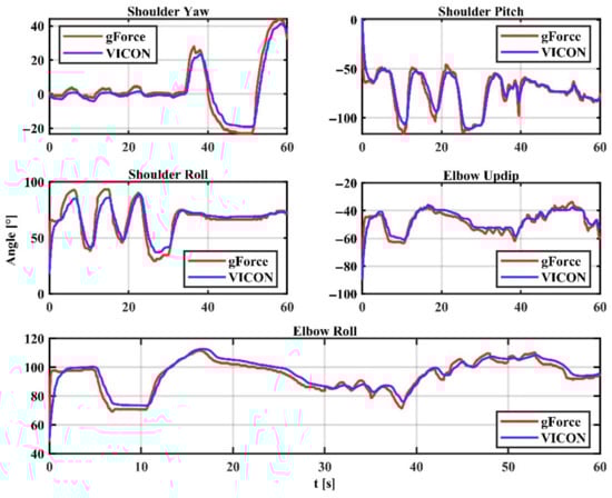 The arm joint angles captured by the gForcePro+ armband are compared to those captured by the VICON optical capture system. Figure 13 shows the angles measured by the system and the angles measured by VICON, with close trajectories between the two. In particular, the shoulder and elbow joints were captured with the expected accuracy for the roll angle, indicating that the roll angle correction is effective. The error results are shown in Table 3, with a system RMSE of 4.837 ± 1.433 and an R2 of 0.834 ± 0.073.