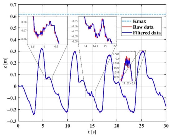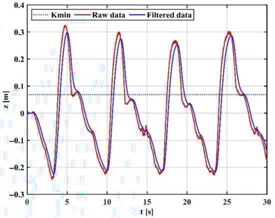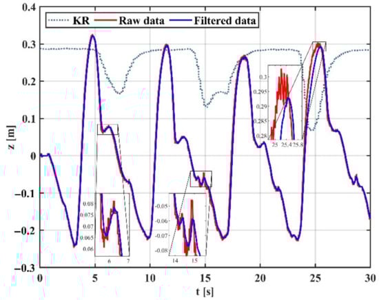 Figure 14 shows the arm trajectory tracking in the Z direction at high gain mode, indicating that the EKF with fixed high gain can capture the motion details well but cannot effectively filter the tremor. Figure 15 shows the arm trajectory tracking in the Z-direction at low gain mode. It can be shown that the EKF with a fixed low gain can filter the tremor well, but the capture of motion details is weak, and there is a delay effect. This is because physiological tremor is generated randomly and unpredictably, and a fixed gain cannot switch the operating intensity of the filter between non-tremors and tremors.