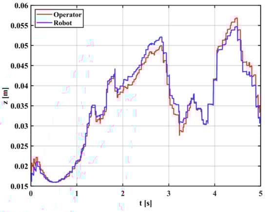 Table 4 shows the error analysis of the teleoperation in the case of tremor and tremor attenuation, with RMSE and goodness of fit (R2) as the analysis metrics. Using the proposed filtering algorithm, the trajectory error between the operator and robot decreased, where RMSE decreased by 0.0009 m, R2 improved by 1.50% and the trajectory tracking performance was enhanced. The reason for this is that the physiological tremor is filtered out, the motor of the robotic arm does not have to start and stop frequently and the motor motion is smooth.