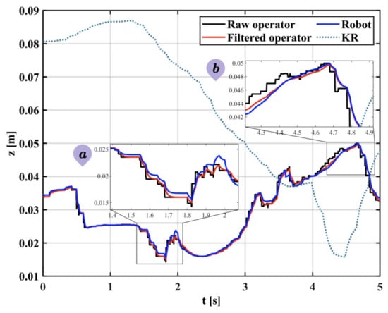 Teleoperation with tremor attenuation: In this experiment, a variable gain EKF is used to process the trajectory data. Figure 18 shows how the filter’s performance varies with muscle activation and the advantage of the variable gain EKF in response to uncertainty tremor. Subplot a shows that, in the case of a smooth state, the gain coefficient KR is at a high value and the filter only plays a smoothing role. Subplot b shows that, in the case of significant tremor, the gain coefficient KR decreases rapidly, the filter performance is enhanced, the tremor is attenuated and the trajectory becomes smooth without delay. The actual trajectory of the robot follows the change of the reference trajectory well, which reflects the better performance of the proposed method in terms of real-time tremor attenuation.