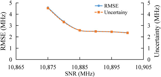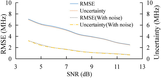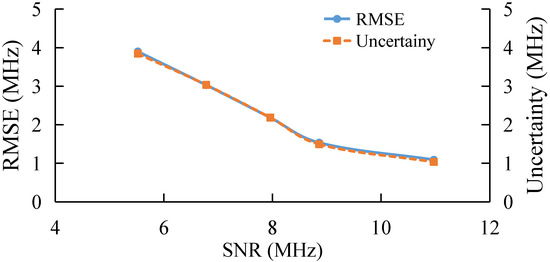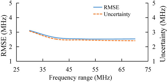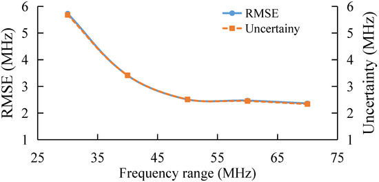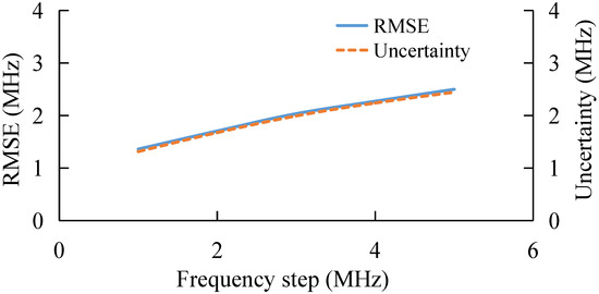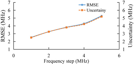Finally, the performance of the algorithm is also studied experimentally under different frequency step, as shown in Figure 13. With the increase in frequency step, the RMSE and uncertainty of the AdaBoost Algorithm gradually increase, which verifies the simulation conclusion that the extraction error of BFS by AdaBoost gradually increases when the sparsity of the feature set becomes larger and the number of features becomes smaller.