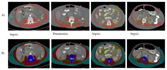Examples of CT images following AutoMATiCA (test method) analysis (A) compared to semi-automated SliceOmatic (reference method) analysis (B). Discrepancies in tagging (i.e., coloring of different tissues) by the test method were noticed for all the abdominal tissues at this landmark (skeletal muscle and adipose tissues). The inconsistent performance of the test method was noted mainly in patients with a critical illness diagnosis.
