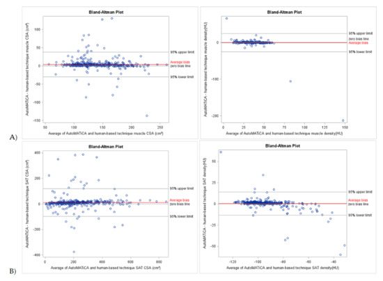 Bland-Altman plots of body composition parameters between test (AutoMATica) and reference (SliceOmatic plus ABACS + manual correction) method for entire sample. Plots show cross-sectional area (CSA) and density for muscle (A) and subcutaneous adipose tissue (SAT, B). Limits of agreement within 1.96 standard deviations are shown with average bias (red line) for each plot.