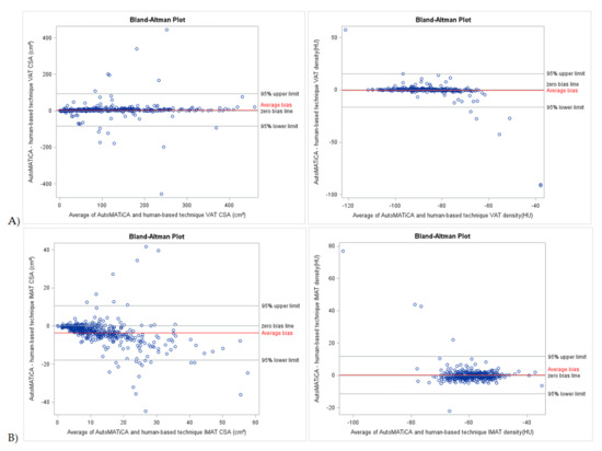 Bland-Altman plots of body composition parameters between test (AutoMATica) and reference (SliceOmatic plus ABACS + manual correction) method for entire sample. Plots show cross-sectional area (CSA) and density visceral adipose tissue (VAT, A), and intermuscular adipose tissue (IMAT, B). Limits of agreement within 1.96 standard deviations are shown with average bias (red line) for each plot.