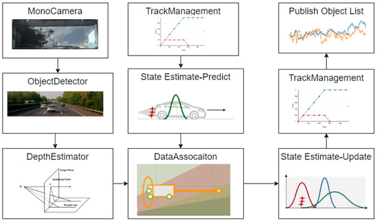 The complexity of the system lies in the fact there are no perfect mono camera detectors and this means that it is susceptible to two kinds of errors: missed detections and false detection. Besides this, under the highway scenario, the number of moving objects in the field of view is unknown. It is difficult to know the state of the moving objects or where they are located and where they are going. Moreover, the multi-target tracking system is often restricted to tracking the objects that are inside the field of view of the mono camera [11], and the kinematic objects may appear or disappear from the field of view. To overcome these challenges and at the same time keep the advantage of the mono camera, a multi-object tracking system based on the mono camera is designed in this paper. It is composed of three main modules: the object detector [12], the depth estimator [13], and the multi-target tracking [3] engine.