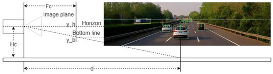 where, is the height mounted on the ego vehicle, is the focal length of the mono camera, is the pixel location of the vanishing point, and is the pixel location of the bottom line in the image plane.