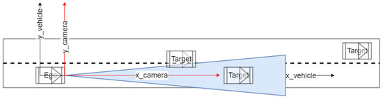 In Equation (6), is the 3D position of the vehicle in the real world. The vehicle is projected to the image plane. This is the mono camera measurement model , the formula summarizes how to compute the image coordinates from a 3D object in vehicle coordinate. Projecting a 3D point to a 2D image plane space makes Equation (6) a nonlinear measurement function. Hence, for a mono camera, it needs to calculate the mapping to convert from Cartesian coordinates to image coordinates. So, the mono camera measurement equation can be defined as Equation (8):