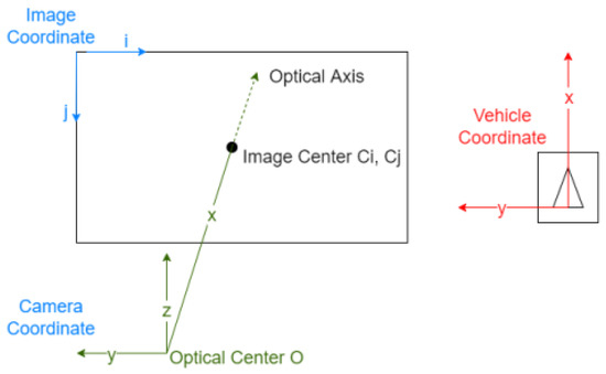 As shown in Figure 6, in the camera coordinate system, the x-axis is the camera’s optical axis. The intersection of the optical axis and the image plane is called the image center or principle point. In the vehicle coordinate system for tracking, the x-axis points forward, the y-axis points to the left, and the z-axis points upward. The image coordinate system usually has its origin in the upper left corner of the image. The pixel coordinates are denoted by for the horizontal dimension and for the vertical dimension. Note that the pixel is not necessarily perfectly square. Instead of a single focal length , it may have two numbers that might slightly differ. The image center and the focal length are derived through intrinsic camera calibration.