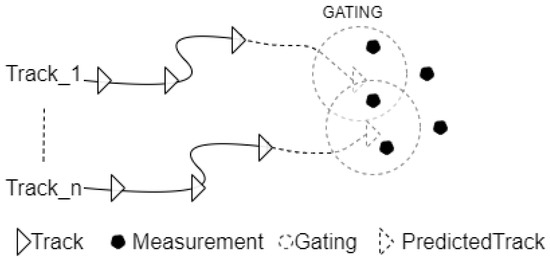 If the measurement lies outside a track’s gate, the distance in the data association matrix is set to infinity as shown by Equation (18):