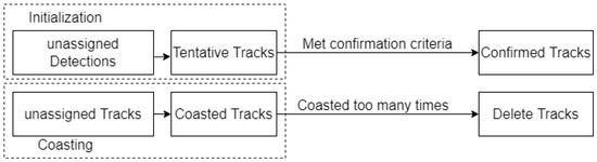 A track has a lifecycle of initialization, confirmation, update, coasting, and deletion. The mono camera-based multi-target tracking system must have its track management module. The track management strategies adopted by this paper are shown in Figure 9.