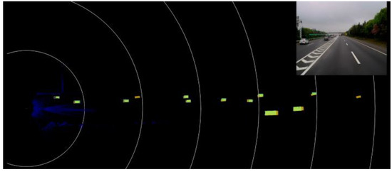 The test and validation of the YOLO-based detector is done under the highway scenario with good weather condition as show in Figure 11. This paper divides the objects on the highway into three classes: vehicle, car and truck. The whole scene is composed of a total of 16,859 objects and the detector detects 15,730 objects successfully. The performance of the detector is shown in Table 1.