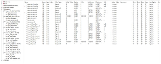 The target car transfers the kinematic information to the ego car through the data transceiver and finally reaches the MCU board. The MCU board also receives the information from the ego car through series communication and then processes the data from the ego car and target car, then obtains the kinematic information of the target car in the ego car coordinate system. Finally, the result is sent out through the CAN bus. The CAN signal is shown in Figure 15.