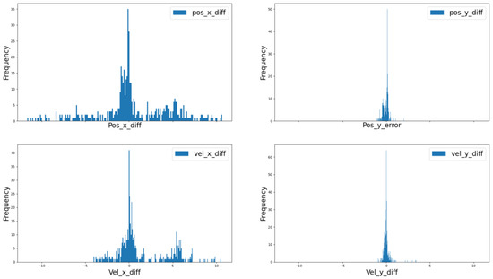From Figure 17, it can be seen that the mono camera-based tracking system has better performance in lateral compared with longitudinal. From Table 2, it can be seen the position accuracy in longitudinal is less than 1.13 m and in the lateral is less than 0.11 m, which indicates that the mono camera system has better lateral accuracy. However, there exists disturbance in both the lateral and longitudinal velocity. Besides this, when the target car has maneuvers such as acceleration, deceleration, cut in, or cut out, the performance will decline as shown in the red frame. The longitudinal and lateral position and velocity error frequency can be seen in Figure 18.