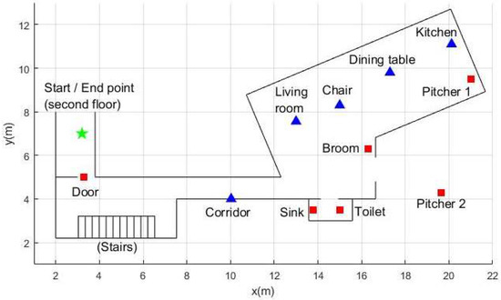 Map of the house. Top view of the house where the dataset was collected. The green star indicates the start and end coordinates of data collection. The blue triangles represent stationary beacons, and the red squares are active or mobile beacons.