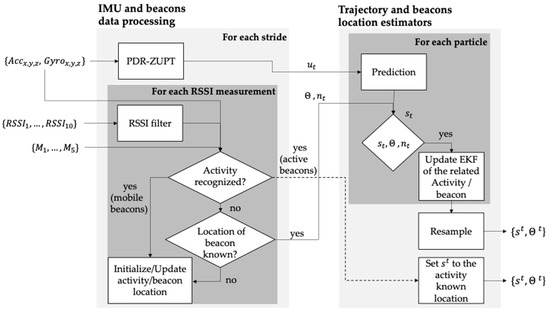 Proposed framework. The left block receives IMU and beacons data, executes a pedestrian dead-reckoning algorithm, initializes the beacon’s location, and recognizes the human activities. The block on the left implements the three phases of a particle filter algorithm: prediction, update, and resample. As a result, the person and beacon’s indoor location are obtained.