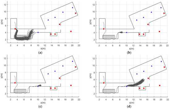 Example of obtaining a trajectory with the particle filter. Blue triangles represent stationary beacons. Red squares represent active and mobile beacons. (a) The person walks from the second floor into the corridor. In the prediction phase, the filter estimates the possible trajectories, denoted by dark gray lines. (b,c) the person enters the range of a stationary beacon placed in the corridor. The particles are updated with the RSSI data from that beacon, and the resampling process is executed. The filter converges in a single trajectory (d). The person continues on his way to the kitchen. The process is repeated.