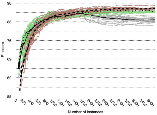 In total, 3716 examples were extracted from the data of the 22 participants. On average, there were 169 examples per participant. The evaluation process was similar to the leave-one-subject-out method. As the data stream classification algorithm is trained example by example, an arff file was created in which the examples of the participant were placed at the end of the file, after the examples of the other 21 participants. In addition, the examples of the 21 participants were randomized in each file to obtain results that show the variance of the F1 measure between participants and hinder the algorithms’ learning process.