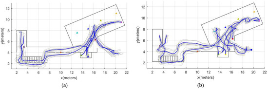 The location of each beacon is calculated independently with extended Kalman filters (EKF). Since beacons only provide information about their proximity but not orientation, the EKF had to be adapted based on the range-only SLAM method proposed by Menegatti [31]. Every time an RSSI reading is received from a beacon whose location is known, the distance between the beacon and the person’s position given by the current state of each particle is calculated. With these data, the EKF updates the beacon’s position and the weight of each particle. Finally, the resampling process eliminates particles with very low weights and replaces them with those with higher weights. This process is performed by the systematic resampling method [32]. In conclusion, the framework is able to locate the beacons from scratch based on the information from the PDR-ZUPT module and the RSSI measurements of the beacons. Therefore, the information of the position of the beacons and the location of the person is complemented and updated as the person moves in the indoor environment. An example of how the particle filter is responsible for estimating the person’s trajectory can be seen in Figure 5.