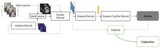 The proposed Dynamic Attention Convolutional Network (DACN). (1) Attention generation (Blue line): Firstly, the frame sequence is fed into the Encoder Network to get the feature representation of each frame. Then the attention maps will be generated by the Attention Network from these original feature representations. (2) Decision generation (Black line): the masked frame, which results from the pixel-wise multiplication of the original frame and the attention mask, is fed into the Encoder Network to get the feature vector for a single frame. Then the Temporal Network is used to encapsulate time-related information. The Dynamic Classifier Network is then used to provide the final decision about the input frame sequence. (3) Explanation generation (Green line): The Explainer function explains current decisions.
