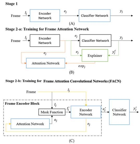 First two training stages: (A) Stage 1, (B) Stage 2-a: Training for Frame Attention Network, (C) Stage 2-b: Training for Frame Attention Convolution Networks (FACN). Blue boxes indicate the sub-network(s) trained in each stage. Stage 1 is a typical DNN architecture for classification. Stage 2 has two phases. In 2a, the Attention Network is trained with the pair of the encoded frame and the spatial explanation from the Explainer function. Then, the Frame Attention Convolutional Network (FACN) is trained end-to-end using new data. The green lines indicate the explanation generation process. The orange lines indicate the training steps to learn with explanations. The yellow line indicates the original frame and the features generated from the original frame.