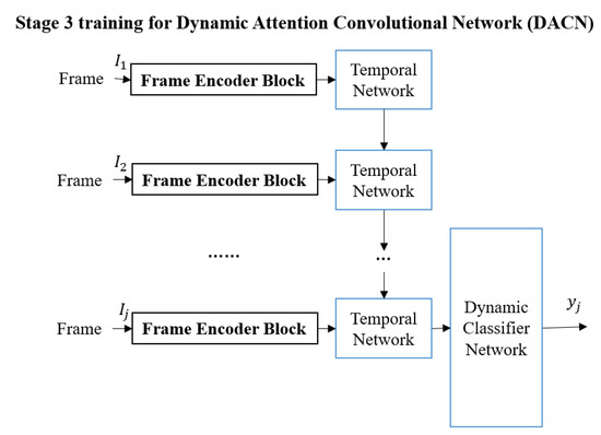 The third stage (shown in Figure 3) is used to train the Temporal Network. The deep architecture in Stage 3 is named the Dynamic Attention Convolutional Network (DACN) to emphasize incorporating temporal information. Each video in the training set will be used to train the Temporal Network Temporal() which consists of two Long Short Term Memory (LSTM) layers [37,38] to obtain a fixed-length feature for each video. The Temporal Network is used to determine the significant information in the video.