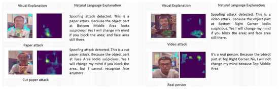 In the proposed work, two different approaches are adopted to demonstrate the usability of the explanations using both visual and verbal formats. Providing explanations with both visual form and natural language form allows the proposed system to be more transparent and trustworthy for users. The verbal interpretation helps users appreciate the meaning of the visual salience map. And the visual salience map helps to generate “clear-cut” verbal explanations which focus on the spatio-temporal relations between different filters and objects. Additionally, the explanations are integrated within the proposed algorithm to improve the training of the attention stage resulting in a measurable improvement in detection performance. While recent literature includes papers [15,17,30,31,32] that use explainable AI for biometric recognition, the present work focuses solely on the problem of presentation attack detection for the face modality.