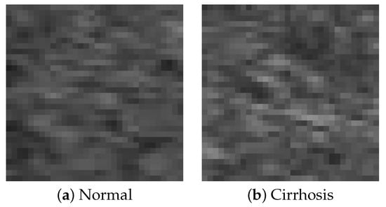 In this study, B-mode liver ultrasound imaging is focused on. B-mode ultrasound image data was provided by the collaborator. These data include 12 cirrhosis patients and 8 normal subjects. There were five ultrasound images per person. Figure 1 shows B-mode liver ultrasound images. Figure 1a,b show a normal and a cirrhosis liver, respectively. In this study, we focus on classifying regions of interest (ROIs) from the B-mode ultrasound images. Figure 2 shows examples of ROI images. The ROI images were manually cut out from the liver areas by a physician. A total of 200 normal and 300 cirrhosis ROI images were collected. Figure 2a,b show normal and cirrhosis livers. The size of each ROI image was 32 by 32 pixels. The grey level was 8 bits. Thus, the values ranged from 0 to 255. This is a typical two-class problem, normal or cirrhosis. From this figure, it seems difficult to visually classify a liver as normal or cirrhosis if one is not a physician because of noisy ultrasound images.