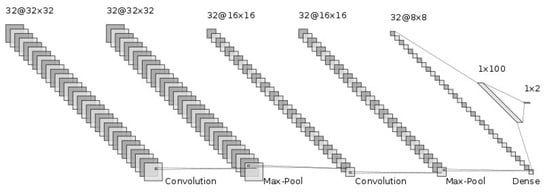 The generalization ability of CNNs has been improved by adding more layers to deeply train the networks [,]. We hoped that the deep nets would improve the generalization ability for this difficult cirrhosis pattern recognition problem. From our preliminary experimental results, the deeper nets could memorize all the training samples. However, they seemed not to address the unknown test samples. This is known as over-training. In particular, the number of available samples, such as in this set of medical data, is limited. This is known as the small sample size problem in the pattern recognition field [,]. With small training sample sizes, deeper nets do not work well. Therefore, we conducted our investigation using shallow nets. The generalization ability of CNNs depends on their network structure and the parameters to be determined. First, we showed the CNN architecture, which is the same as in []. Figure 3 shows the structure of the CNN. The input of the CNN is the ROI image of a 32 by 32 size. Firstly, we convolved the ROI image using 32 filters with a 3 by 3 filter size. Furthermore, through 2 by 2 max-pooling, we reduced the ROI image size to a half-sized image, 16 by 16 in size. Secondly, we repeatedly convolved and performed max-pooling in the same manner. Then, we obtained 32 images 8 by 8 in size. Thirdly, we flattened this image into a 2048 (=32 by 8 by 8) dimensional vector. To implement the classification stage, we used a fully connected artificial neural network, with one hidden layer and 2 output neurons for {cirrhosis, healthy}. We explored how performance varied with the number of neurons, with 100 neurons in the final configuration, which was 2048-100-2. The intermediate activation functions were ReLU, and the output layer used softmax. The dropout rate was 0.5, with a batch size of 400. The network was optimized using ADAM over 100 time periods.