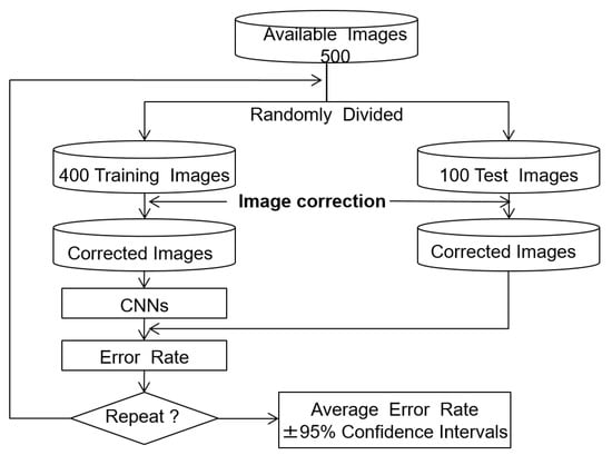 The training used 500 ROI images, with 200 healthy and 300 cirrhosis examples. The effectiveness of the image correction methods was evaluated by comparing the classification error rates, which are the defined as the ratio of misclassified test images to the total number of test images. The holdout method was used to estimate the error rate, as the evaluation images were independent of the training and test images [,]. We report the average error rate, which gives an indication of the generalization of the classifier. The algorithm for error rate estimation is shown in Figure 6. In each trial, the 500 ROI images were split into 400 training (160 normal and 240 cirrhosis) and 100 test (40 normal and 60 cirrhosis) images. The training and test images were then modified using the tone curves as described above. The CNN was trained using the training images and the error rate was computed using the test images. This process was repeated 10 times with different random splits of the training and test images to estimate the average error rate and 95% confidence interval.
