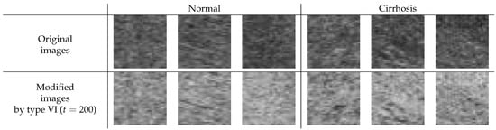 Enhancing the image contrast of ROI images is considered to lead to improved image quality, at least when considering human viewing. Here, we investigated whether the contrast enhancement would also help reduce classification error rates. Type VI () showed the best average error rate in our limited experiments. Thus, we tried to observe the modified ROI image with the image correction method of type VI. Figure 7 shows the difference between the original and the modified ROI images for normal and cirrhosis livers. From the appearance of the modified images and the experimental results, we draw the following conclusions: