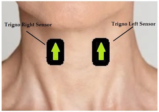 Participants sat comfortably, and the skin around the neck was prepared using alcohol wipes. Two Delsys Trigno sensors (Delsys Incorporated, Natick, MA, USA) were set as sEMG and placed on the belly of the sternohyoid muscles (infrahyoid group), as shown in Figure 1. The sternohyoid muscles were chosen, as these are the most superficial muscles of the infrahyoid group. The correct anatomical placement of the sensors was identified via palpation of the neck muscles of the participants, as the distancing and position were highly dependent on the sex and body conformation of participants. We collected data collection using two pieces of equipment. A TREE KHR502 electronic scale (resolution of 0.01 g and a capacity of 500 g) was used to measure the volume of water ingested by the subjects during each task. The Delsys Trigno wireless EMG system (gain: 42 V; bandwidth: 20–450 Hz, sampling rate: 1 kHz) collected the sEMG signals produced during the swallowing process. The length of each recording was manually set as 10 s.