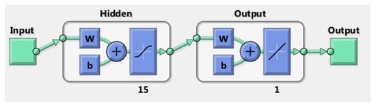 The linear regression model proposed in this study used the recorded sip volumes as response variables and the extracted features as predictor variables. The model specification was set to linear, meaning that the model contained an intercept and a linear term for each predictor, and it used ordinary least squares as a fitting method. Cross-validation was set to 5 k-fold. The ANN model consisted of one layer of 15 neurons with a hyperbolic tangent sigmoid transfer function and a linear transfer function for the output layer, as shown in Figure 2. Data division was performed at random, and the Levenberg–Marquardt algorithm was used for training. As previously described, the optimum feature subset was selected using the forward stepwise selection method.