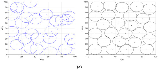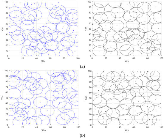 Initial coverage diagram and coverage optimization diagram of COOTCLCO in three cases: (a) q = 25, Rs = 10 m, Iteration = 1500; (b) q = 35, Rs = 10 m, Iteration = 1500; (c) q = 45, Rs = 10 m, Iteration = 1500.