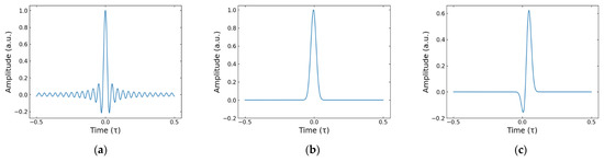 where the cardinality . Figure 1b shows the result of applying this Hamming window, with the side lobes being smoothed out to give a closer appearance of a single peak. To generate a sampling kernel which represents a single THz pulse, two of these SoS peaks were combined by offsetting and scaling one of the SoS pulses, as shown in Figure 1c. The offset between the pulses was equal to the width of the center peak at 0 amplitude and the relative scaling difference was a factor of −0.6. These were selected by comparison to a real THz reference and can be automatically tailored to a specific experimental reference as demonstrated later in this paper.