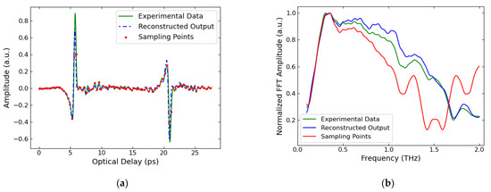 Experimental verification of our THz FRI method. (a) The raw data, shown by the green line, are reflections off the sides of a thick plastic block. The sampling points are shown by the red dots, which were used as the input for the method. The resulting reconstruction is shown by the dashed blue line. (b) The normalized FFT spectra for these data.