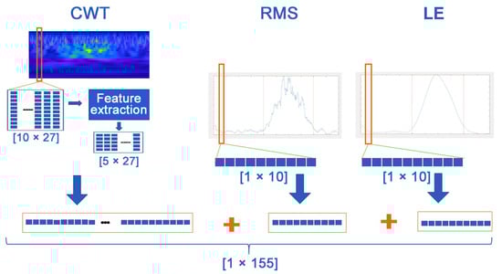 To adopt the most suitable input to the neural network, preliminary experiments were performed, evaluating four different alternatives: LE, RMS, CWT scalogram, and their concatenation (LE + RMS + CWT). The concatenation consisted of a min–max normalization of the outputs of the different processing procedures, thus mapping the values in a [0, 1] range, and a concatenation of outputs of the different processing procedures (Figure 1). These choices were motivated by the related literature, where LE and RMS of the sEMG proved to be suitable signals to train the neural network for gait analysis [,,], even if the prediction tasks were different from the one addressed here. Outputs of time-frequency analysis (spectrograms, scalograms) were also features often used in sEMG analysis, as for example in [] to predict muscle activations. Before training the classifier, the concatenated vector was segmented in overlapping sliding windows of 10 samples, where each window was shifted of one sample with respect to the previous window. Each window was used to label that single sample, according to the value of the related ground truth in the window. The single sample was labeled as 1 (muscle activity) or 0 (no muscle activity), according to the most frequent ground truth value identified in the window. The size of the processed windows, the simple neural network architecture, and the use of sliding windows provided a very low latency of 3–4 milliseconds, which could be suitable for real-time applications.